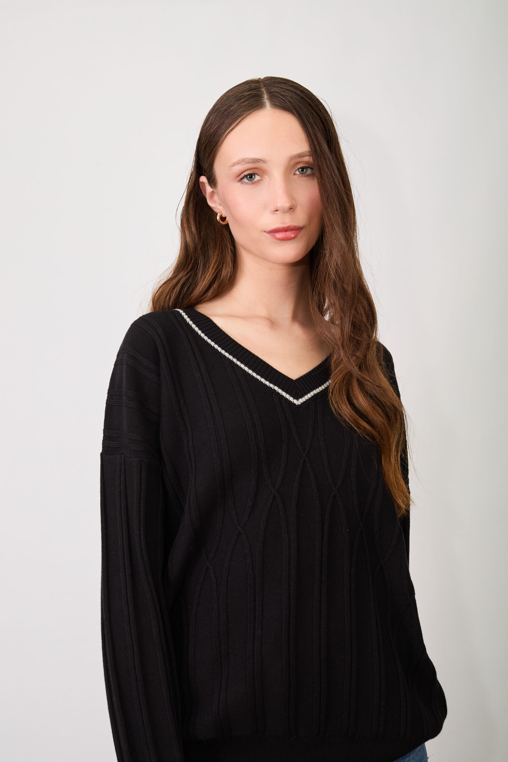 Sweater con cuello en escote v de moldería cuadrada y largo modular a la primera cadera. Tiene detalle de canelones ene toda la prenda y un cruce en delantera. Combina con vivos en escote para darle un aspecto único. Punto acanalado en cuello, puños y cintura.